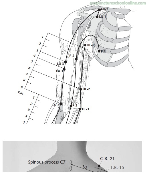 Perpendicular insertion in the direction of Jianjing GB-21 0.5 - 1 cun, avoiding the axillary artery
