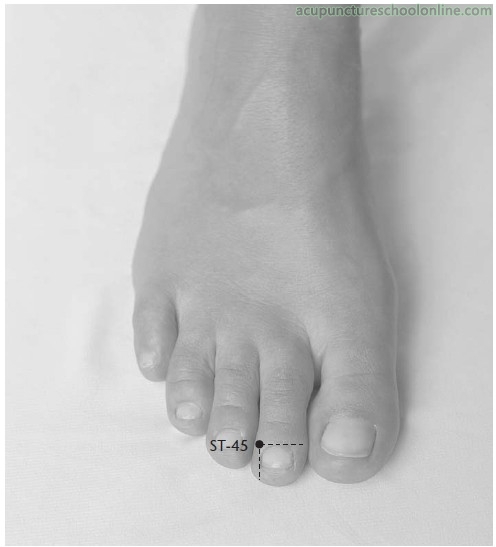 On the dorsal aspect of the second toe, at the junction of lines drawn along the lateral border of the nail and the base of the nail, approximately 0.1 cun from the corner of the nail.