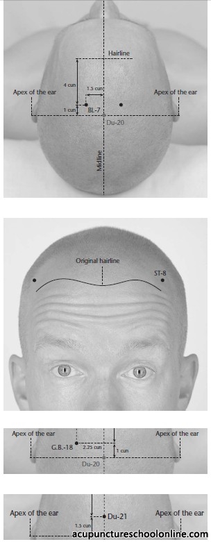 1.5 cun posterior to Chengguang Bl-6 and 4 cun within the anterior hairline, 1.5 cun lateral to the midline. More simply located 1 cun anterior and 1.5 cun lateral to Baihui Du-20.