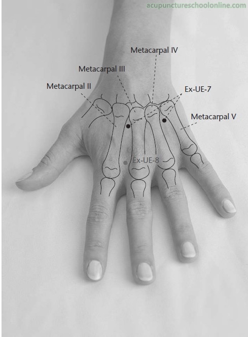 On the dorsum of the hand, two points located between the second and third and the fourth and fifth metacarpal bones, in the depressions lying immediately distal to the bases of the metacarpals.