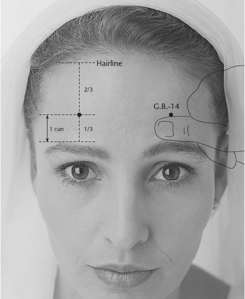 On the forehead, 1 cun superior to the middle of the eyebrow, directly above the pupil when the eyes are looking straight ahead. The distance between the eyebrow and the anterior hairline is measured as 3 cun.