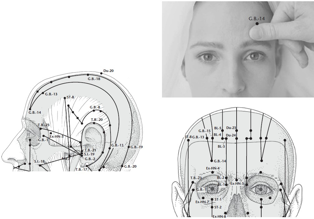 Among the Gall Bladder points of the head, there appear to be some that indicate they are special points for influencing the Zangfu and Channels, similar to the Front or Back Shu points. The name "Yang White" is a reference to Large Intestine channel and its influence over Yangming type headaches would make it a suitable candidate for the head-Shu for the Large Intestine.