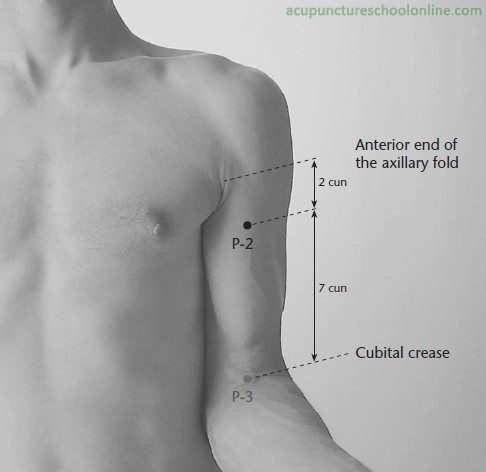 On the anterior aspect of the arm, 2 cun below the anterior axillary fold, between the two heads of the biceps brachii muscle.