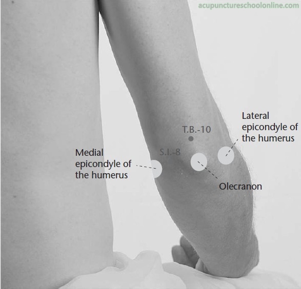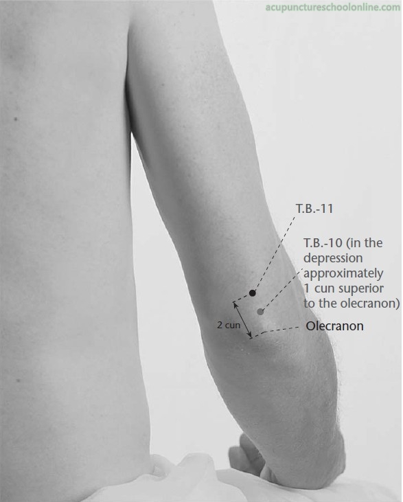 With the elbow flexed, this point is located 1 cun proximal to Tianjing SJ-10.