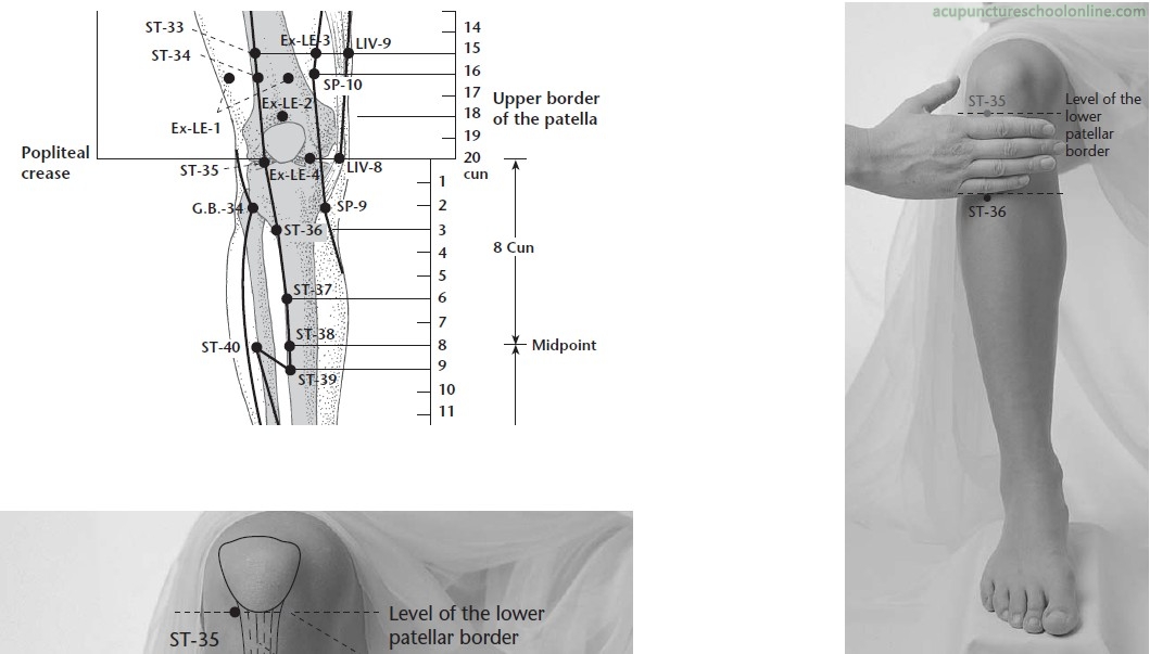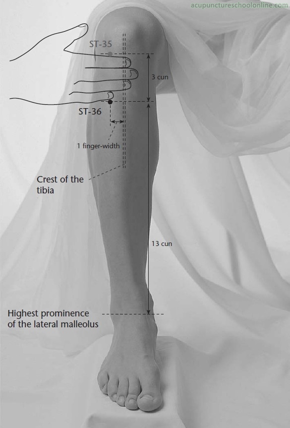 Below the knee, 3 cun inferior to Dubi St-35, one fingerbreadth lateral to the anterior crest of the tibia.