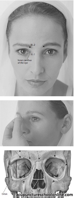 Transverse-oblique insertion inferiorly towards Jingming Bl-1 for eye diseases, or Transverse lateral insertion to join with Yuyao (M-HN-6) for supraorbital pain, or prick to bleed for heat disorders.