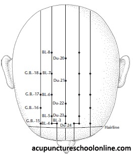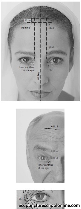 Directly superior to Zanzhu Bl-2, 0.5 cun within the anterior hairline, level with Shenting Du-24