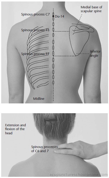 Perpendicular-oblique superior insertion 0.5 - 1 cun, or transverse inferior insertion up to 6 cun in "xiangwei needling" to connect with Taodao Du-13, Shenzhu Du-12, Shendao Du-11, Lingtai Du-10 and Zhiyang Du-9.