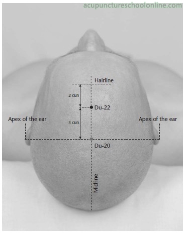 The "59 piercings" are named in the Su Wen Ch. 61 and mentioned in Su Wen Ch. 32 for treating Heat diseases. This point along with Shangxing Du-23, Qianding Du-21, Baihui Du-20 and Houding Du-19 clear Heat from counterflow in the Du channel.