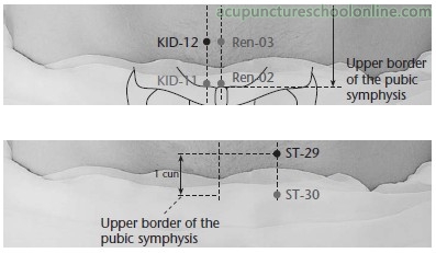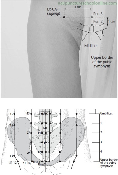 Perpendicular insertion 0.8 - 1.2 cun, or for prolapse of the uterus direct the needle through the muscular layer to Qugu Ren-2, then rotate the needle until it wraps around the muscle fibres and firmly pull it upwards and outwards and tape it to the skin in this raised position for 20-30 minutes.