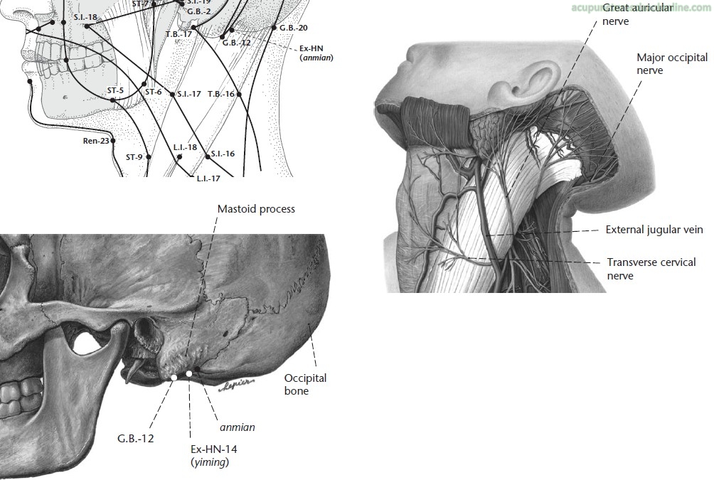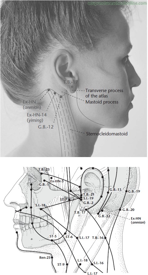 A modern addition to the extra points commonly used for insomnia. Its location is so close to Wangu GB-12, also indicated for insomnia, that is might well be an alternative location for the same point.