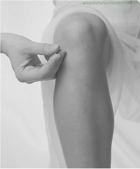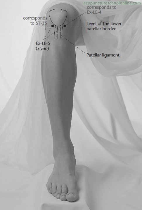 With the knee flexed and supported by a rolled pillow: Perpendicular insertion, directed towards Weizhong Bl-40, 1 - 2 cun, or oblique insertion ins a medial and superior direction behind the patella 1 - 2 cun, or through needling, between lateral and medial Xiyan (M-LE-16) behind the the patellar ligament.
