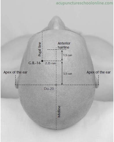 Above the forehead, on a curved line drawn between Toulinqi GB-15 and Fengchi GB-20, following the contour of the cranium, 1.5 cun posterior to Toulinqi GB-15 or one third of the distance between Toulingqi GB-15 and Chengling GB-18 (level with Baihai Du-20).