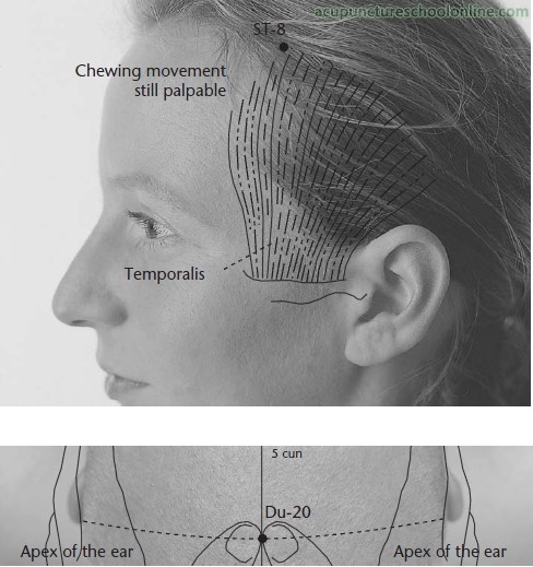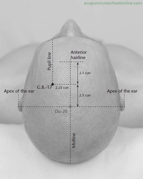 In the parietal region, on a curved line drawn between Toulinqi GB-15 and Fengchi GB-20, following the contour of the cranium, 1.5 cun posterior to Muchuang GB-16 or two thirds of the distance between Toulingqi GB-15 and Chengling GB-18 (level with Baihai Du-20).