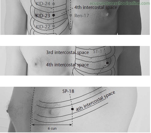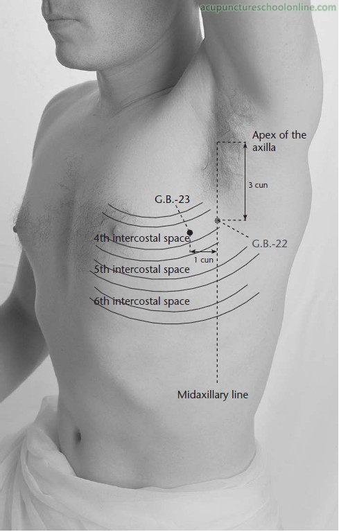 Below the axilla in the fifth intercostal space, 1 cun anterior to Yuanye GB-22, aproximately at the level of the nipple. Some sources locate this point in the fourth intercostal space. The Systematic Classic defines it as 3 cun below and 1 cun anterior to the axilla, on the border of the rib at the side without specifying a particular intercostal space.
