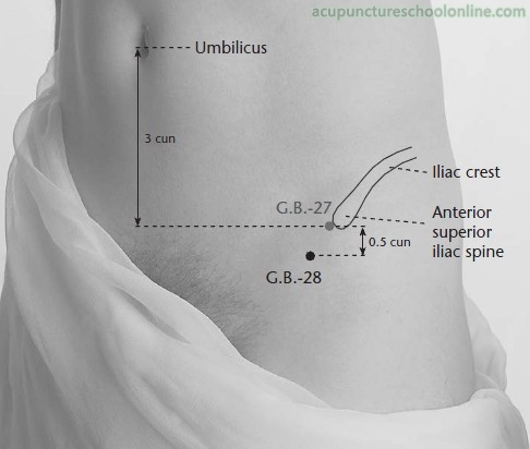0.5 cun anterior and inferior to Wushu GB-27. The Systematic Classic locates it five cun and three fen below Camphorwood Gate (Liv-13).