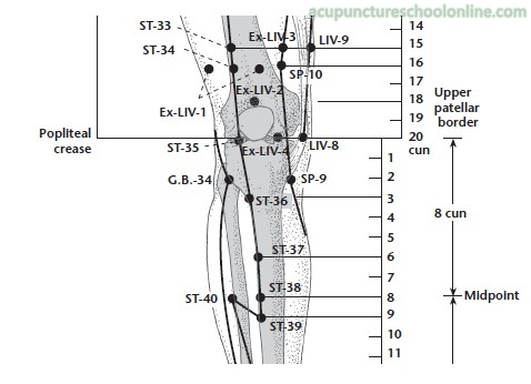 Below the lateral aspect of the knee, in the tender depression approximately 1 cun anterior and inferior to the end of the fibula.