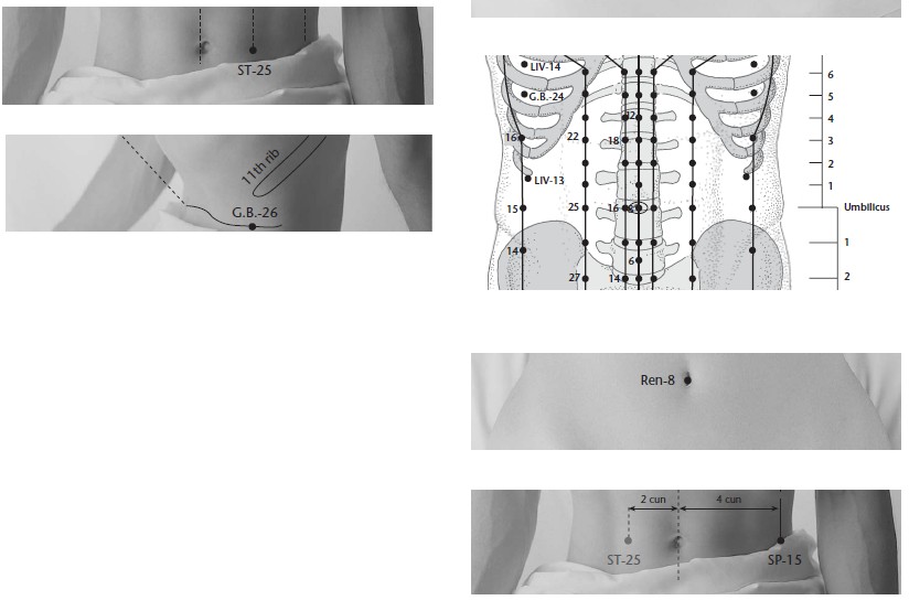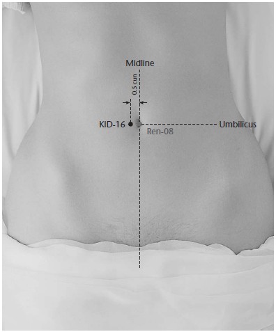 On the abdomen, 0.5 cun lateral to the centre of the umbilicus. Note: The Great Compendium of Acupuncture and Moxibustion locates this 1 cun from the midline.