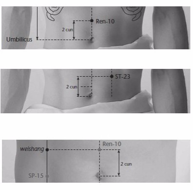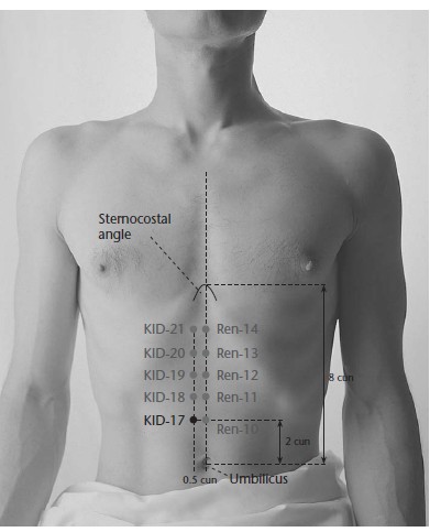 On the upper abdomen, 2 cun above the umbilicus, 0.5 cun lateral to the midline (Xiawan Ren-10). Note: The Great Compendium of Acupuncture and Moxibustion locates this 1 cun from the midline.