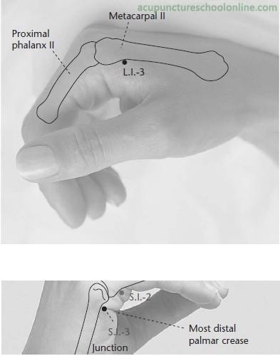 Perpendicular insertion 0.5 - 2 cun, directed towards Houxi SI-3, or transverse insertion to Hegu LI-4 as part of "Jian Xi to Gu Needling".
