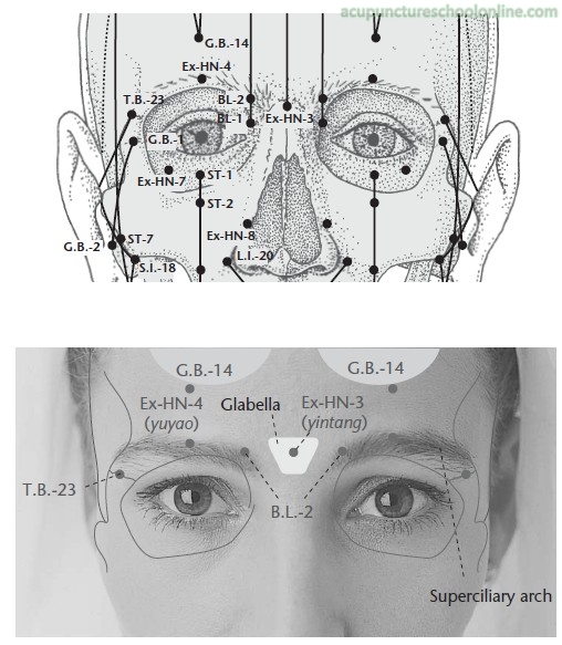 Jin's Three Needles for the Eyes are located at this point, Jingming Bl-1 and a third extra point between the eyeball and the supraorbital ridge. All three are needled perpendicularly 1.2-1.5 cun, pushing the eyeball away while inserting and no stimulation is applied except stroking the handle upwards with the fingernail. They are indicated for optic nerve atrophy, macular degeneration, retinal detachment and other visual or eye disorders (eLotus, 2021).