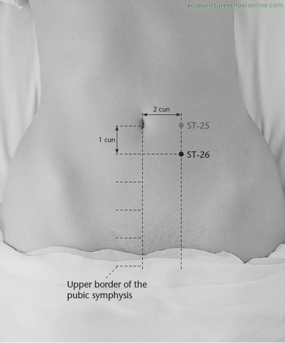They are pricked using Tung's method in local disorders of pain, stagnation and heat in the abdomen such as uteritis, nephritis, umbilical area pain, enteritis, appendicitis and intestinal cancers (McCann, 2014, Pricking the Vessels).