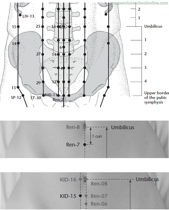 In Tung lineage acupuncture the Bowel Nest 23 (Fu Chao Er Shi San) are a group of points located in a line at 1 cun intervals between Ren-2 and Ren-10. An additional eight points on either side form a 4x5 grid at the levels of Ren-9 to Ren-5, also at 1 cun intervals. This would match with the alternative location for this point given in the Great Compendium. Ren-8, on the navel, is not included.
