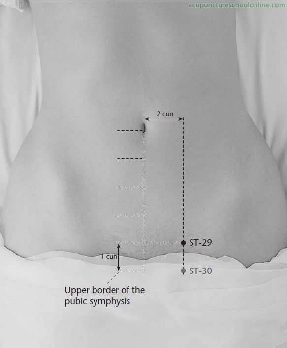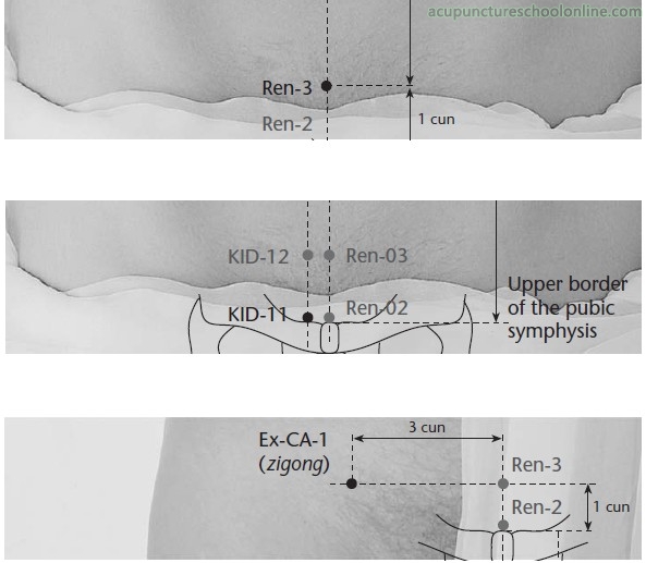 This point would be associated with the Bladder, being in line with Zhongji Ren-3. Its indications have little to do with urinary function but instead seem to focus on the Bladder as the Yang of the Kidneys with infertility or impotence due to Cold, prolapse or seminal emission due to sinking Yang, or Shan (疝) Disorder due to Cold in the genital region.