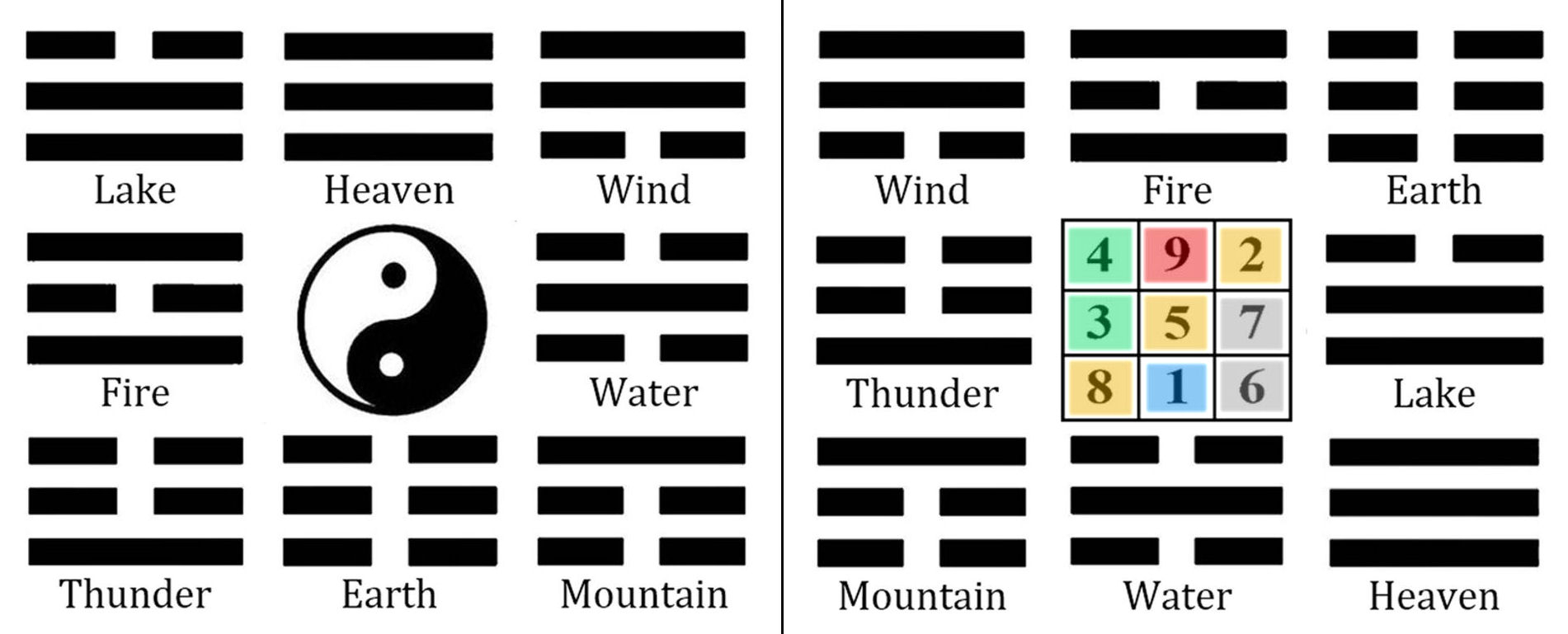 The eight trigrams are then arranged into the eight directions, corresponding with elemental forces of nature. These are arranged into an Early Heaven Sequence, attributed to Fu Xi, to reference a mathematically perfect cosmological order, and a Later Heaven Sequence, attributed to King Wen, which represents the lived experience of the seasons.