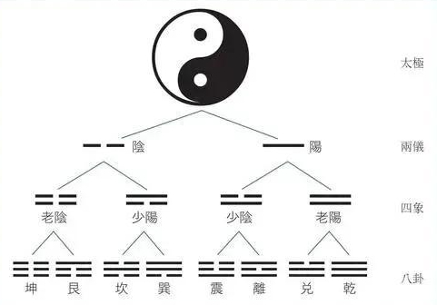 Also called the Zhou Yi (周易, Changes of Zhou), after its estimated composition in the Zhou Dynasty. It is among the oldest of Chinese classics which first outlined the philosophy of Yin and Yang and how their combination and transformation produces change in the world. The occurs by the original unity of the Dao forming two opposing principles, Yin and Yang, represented by a broken and a unbroken line respectively, which then double to form four possible images, and then add a third line to form eight trigrams.